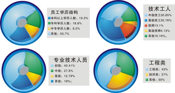 公司现有职工4500余人。中高级职称人员及专业技术人员1400余人,其中:历年来享受政府津贴的专家14人,教授级高工20人,拥有国际杰出项目经理资格认证的项目经理6人、建设工程项目经理岗位职业资质证书的项目经理180余人、建造师资质证书的项目经理160余人;各类技术工人2900余人,其中:技师380余人,高级技师120余人。